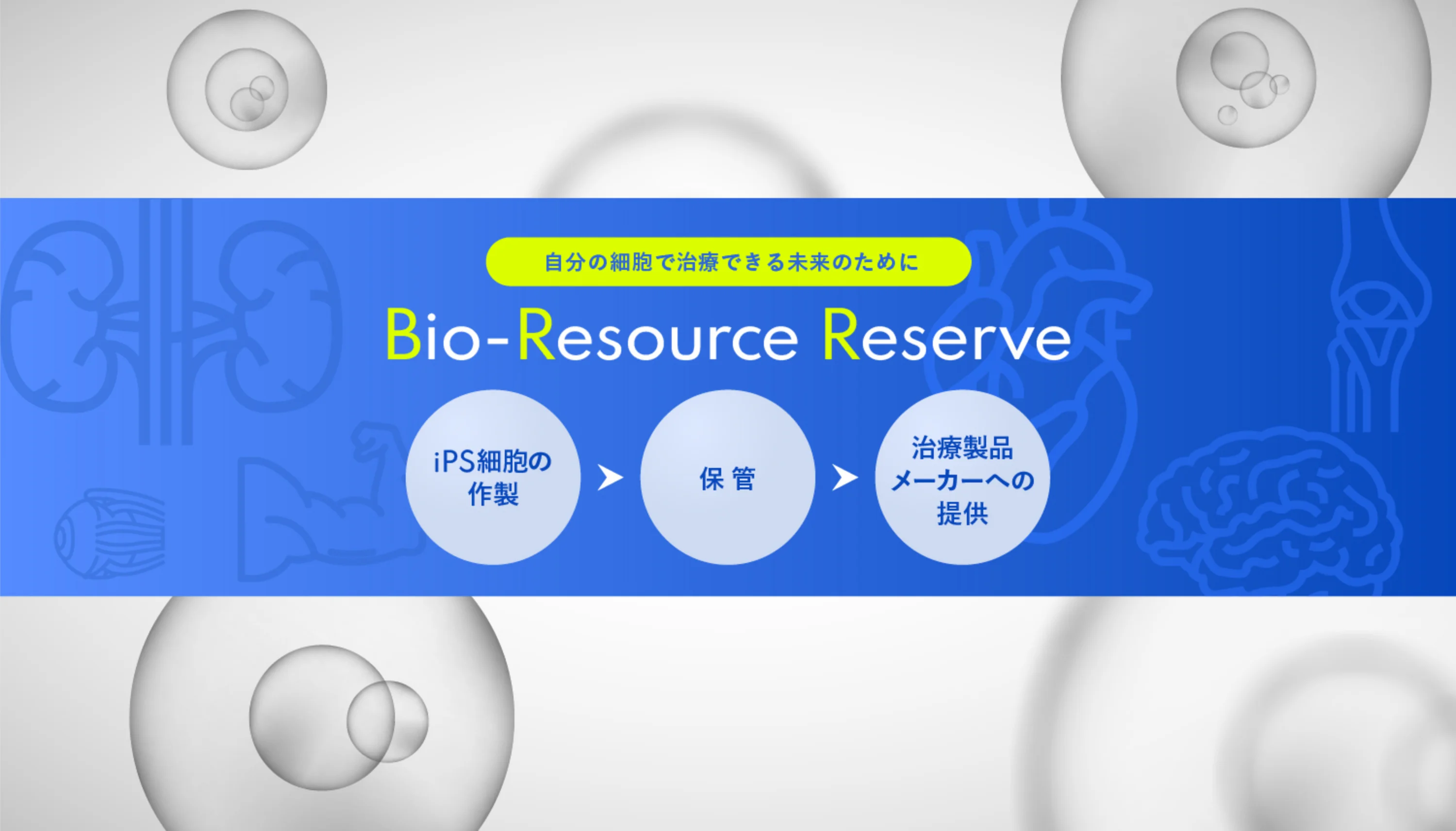 あなたの健康な細胞から質の高いiPS細胞を作製し、長期保管いたします。将来、有効な治療法のない疾患やケガに見舞われた際、保管しておいたiPS細胞を治療原料とすることで、未来の治療選択肢を広げます。また本サービスは、治療製品開発企業が自社でiPS細胞から製造する負担を軽減し、自家iPS細胞の社会実装を後押しします。